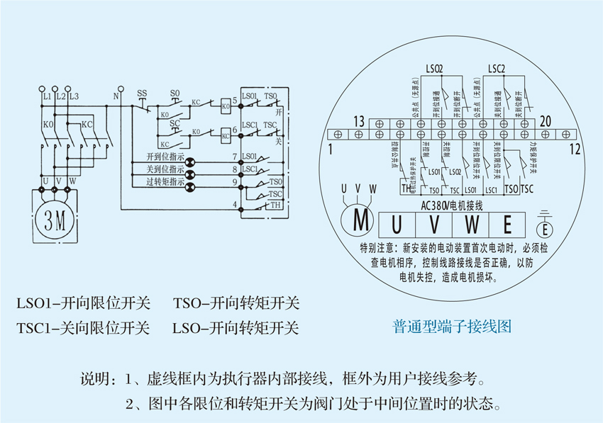允許閥門電動執行器任意位置安裝,但必須注意電機盡量呈水平位置,電器箱按鍵對應,如果不一致立即按停止鍵,切斷三相電源,調換三相電源中的任意二相。